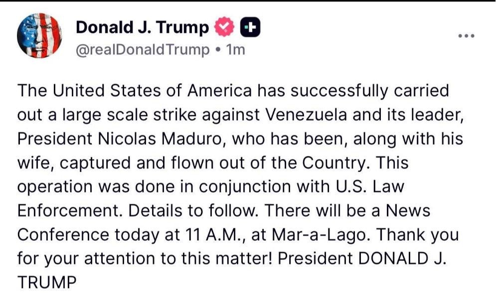 El president dels EUA, Donald Trump, ha confirmat en un tuit el seu atac a Caracas. El president dels EUA, Donald Trump, ha confirmat en un ...